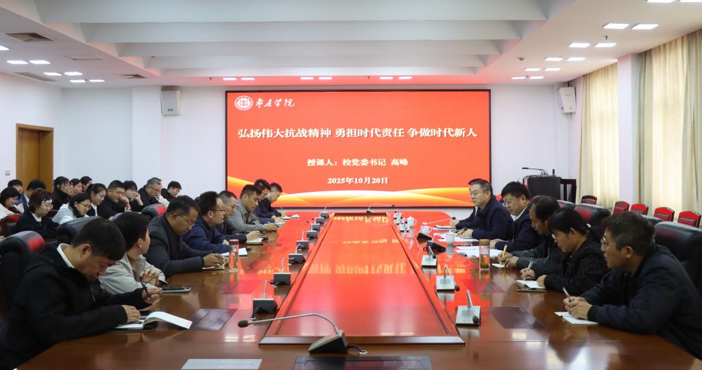 10月20日下午,校党委书记高峰在市中校区综合楼三楼会议室以《弘扬伟大抗战精神 勇担时代责任 争做时代新人》为题为2025级研究生讲授思想政治理论课。校党委委员、副校长李目海主持活动,校党委委员、宣传部部长、研究生处处长闫昕到场听课。
