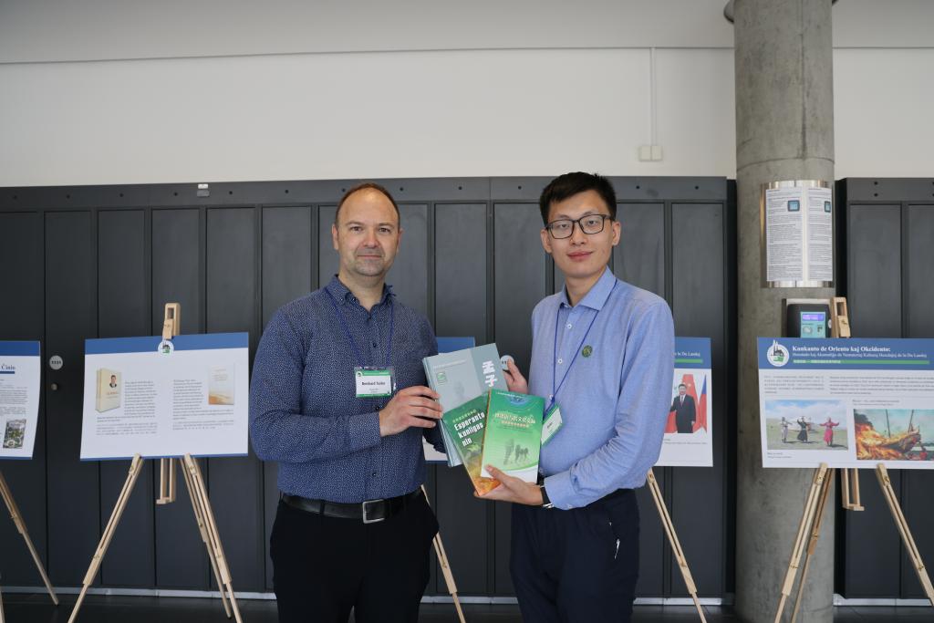 开幕式后,新当选的国际世界语协会主席费尔南多·马亚会见了我校代表,并表示国际世界语协会将一如既往支持我校世界语事业的发展。会上,我校与奥地利国家图书馆维也纳国际世界语博物馆交换了藏品。伯恩哈德先生代表奥地利国家图书馆维也纳国际世界语博物馆接收了我校编译的中世双语《孟子》和《世界语跨文化交际》等图书藏品,向我校捐赠了《计算机术语集》等资料,并希望进一步加强与我校之间的合作。